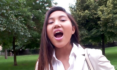 Asian babe gets facial cumshot outdoor after inhaling dick and getting fingered