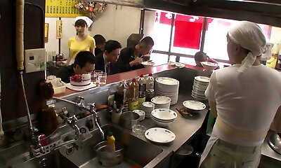 Kitchen maid in Asia Store gets poked by every man in the Shop